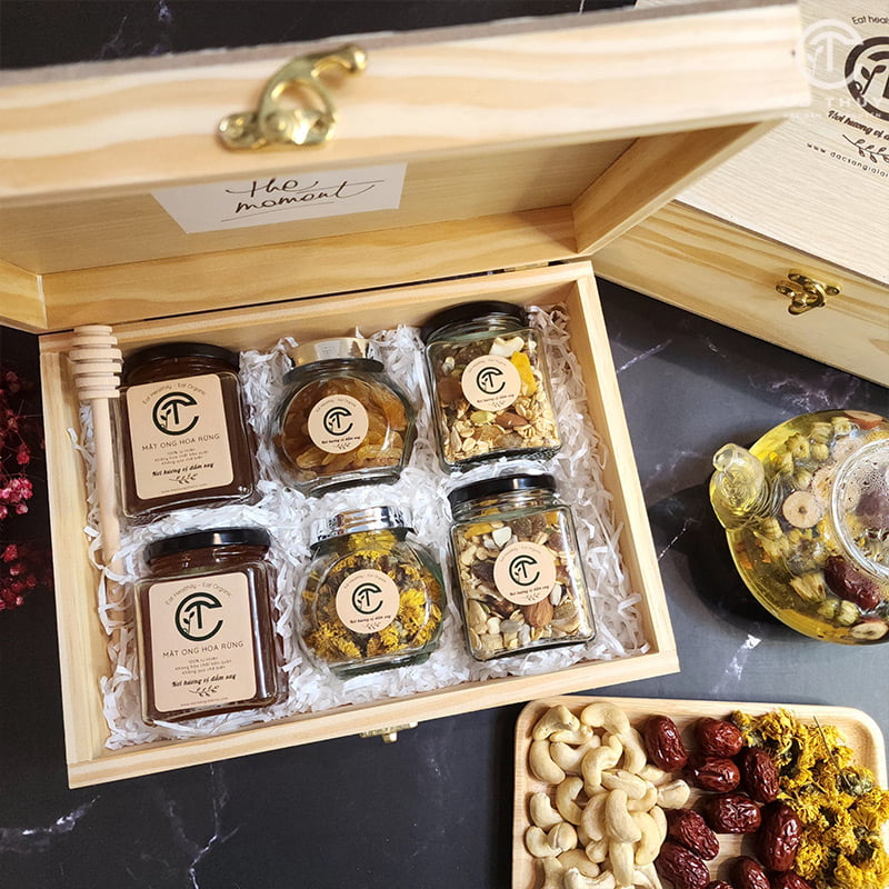 - Điểm ấn tượng: Toàn bộ sản phẩm trong hộp đều đến từ nguyên liệu thiên nhiên, hữu cơ, như trà thảo mộc, cà phê rang mộc, mật ong rừng, hoặc tinh dầu thư giãn. Bao bì làm từ giấy kraft, mây tre hoặc vải bố thân thiện môi trường.